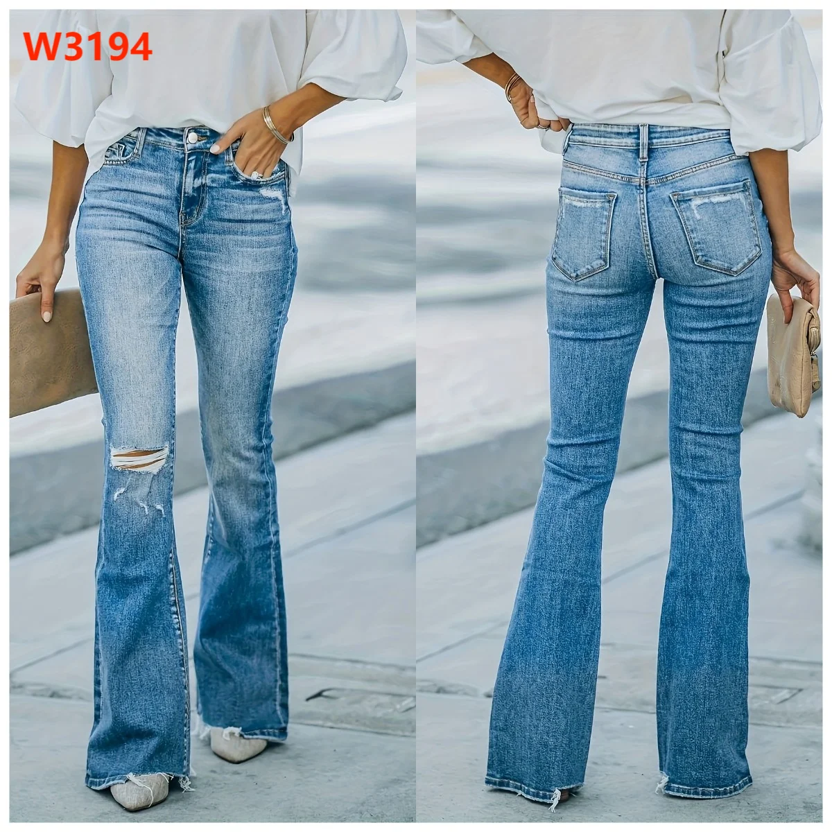 Light Blue White Washed Finish: The light blue white washed finish adds a touch of sophistication to any outfit.,Wide Leg Flare Design: The wide leg flare design offers a flattering silhouette, enhancing your natural curves.,High-Quality Material: Crafted from premium polyester and cotton blend, ensuring durability and comfort.,Versatile Seasonal Wear: Ideal for all seasons, these jeans transition seamlessly from winter to summer.,Vintage Style: Embrace retro charm with these vintage-style mom jeans, perfect for a casual yet elegant look.Sufficient Stock